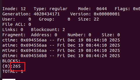 使用 debugfs 分析镜像,定位已删除文件的 inode (如 12 号记录),导出数据块(如 block 265 ),成功恢复 hello.txt 。