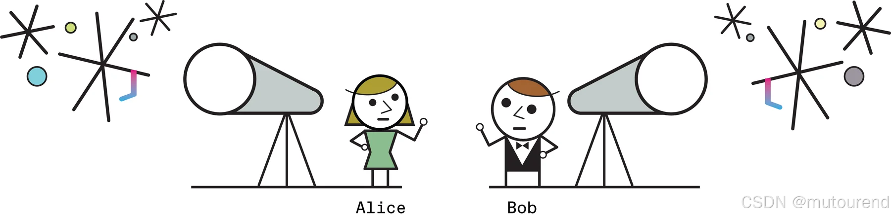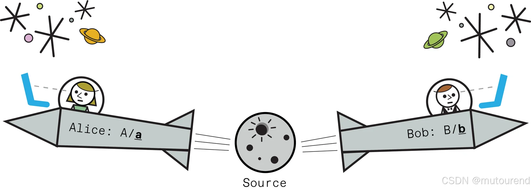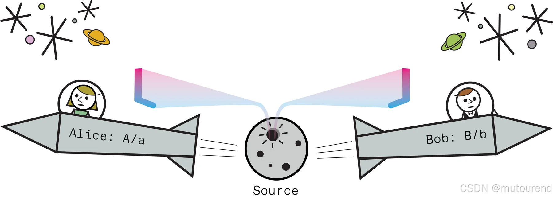 如下图所示,为了避免任何可能的局域效应,爱丽丝和鲍勃飞到彼此相距数光年的位置。他们需要这种隔离,以判断袜子的颜色究竟是预先决定的,还是在测量时才真正发生更新。