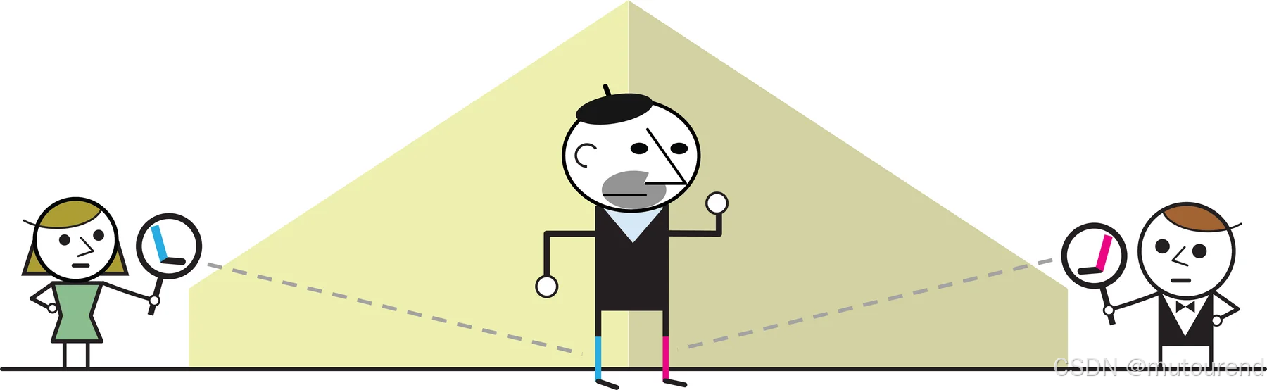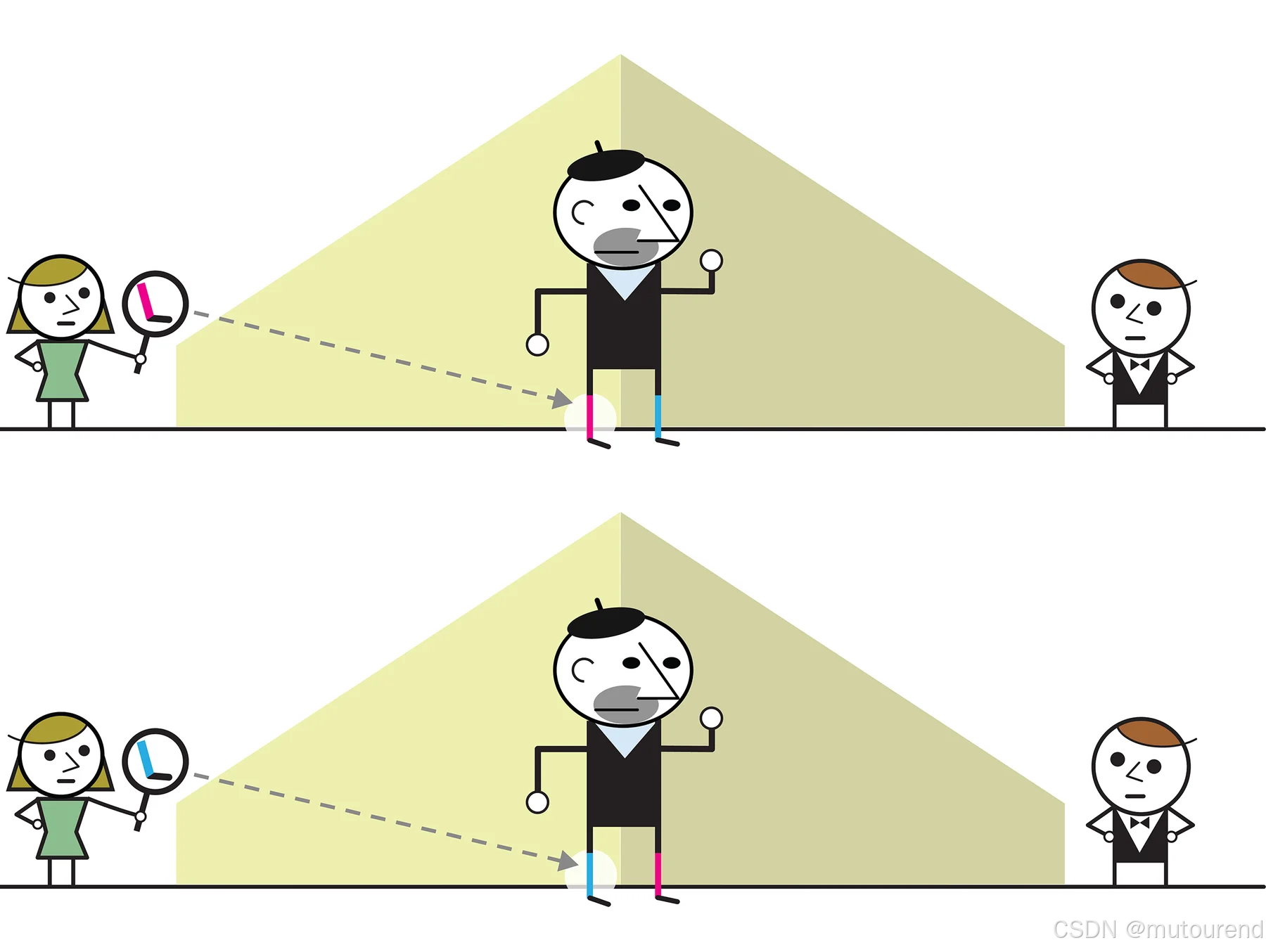如下图所示,爱丽丝看到伯特尔曼教授的右脚袜子是蓝色;鲍勃则看到他的左脚袜子是粉色: