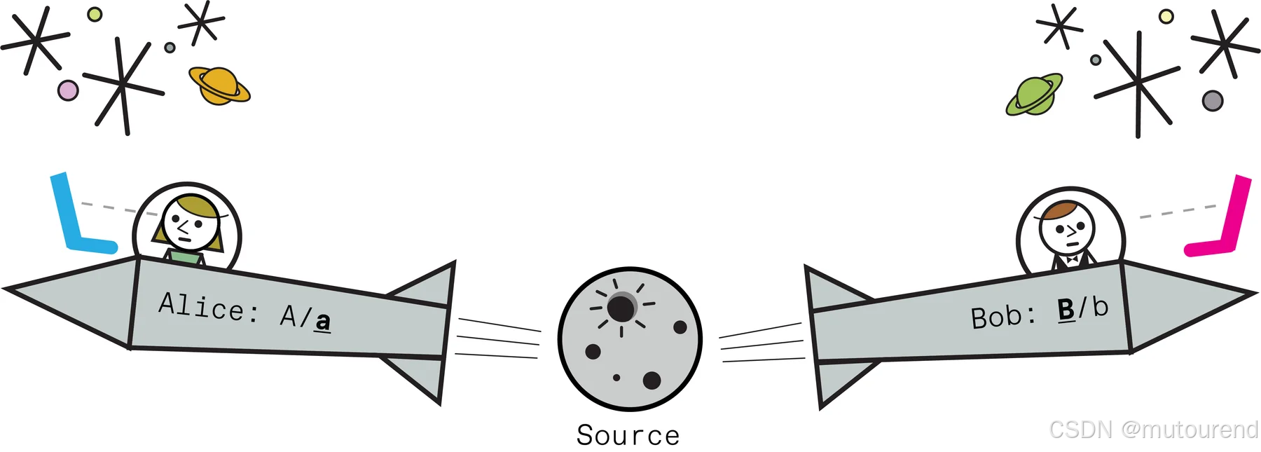- 在这个实验中,爱丽丝和鲍勃分别乘坐宇宙飞船远离地球。一处源头向他们发射成对的纠缠量子袜子。爱丽丝和鲍勃各自配备了带有两种设置的特殊探测器。爱丽丝的探测器可以设置为 A 或 a;鲍勃的探测器可以设置为 B 或 b。(为了选择设置,他们会在袜子发射之后各自抛硬币,因此袜子不可能事先知道探测器的设置。)