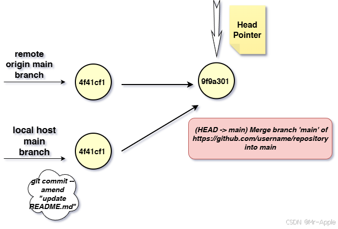改变工作指针,指向上一次最新的提交4f41cf1 ,这个提交呢其实是 并没有包括你READMD.md的提交,跟远程分支保持一致,我猜测是因为我git pull,我本地最新的一次提交和和远程最新的提交有冲突,git 自动合并recursive 机制,又重新创建了一个提交节点,以远程最新提交为基节点,将我本地git commit --amend修改的最新提交信息,合并到了一个新的节点.画了个图