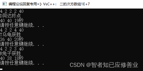 tz:std::cout << (j1 == j2 ? "D同达终点\n" : j1 > j2 ? "R兔子获胜\n" : "T乌龟获胜\n")