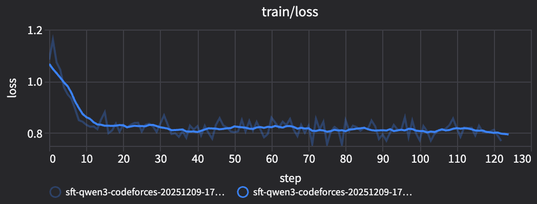 - SFT launched on open-r1/codeforces-cots (solutions_py_decontaminated, 98/2 split) with LoRA on Qwen/Qwen3-0.6B, a10g-
