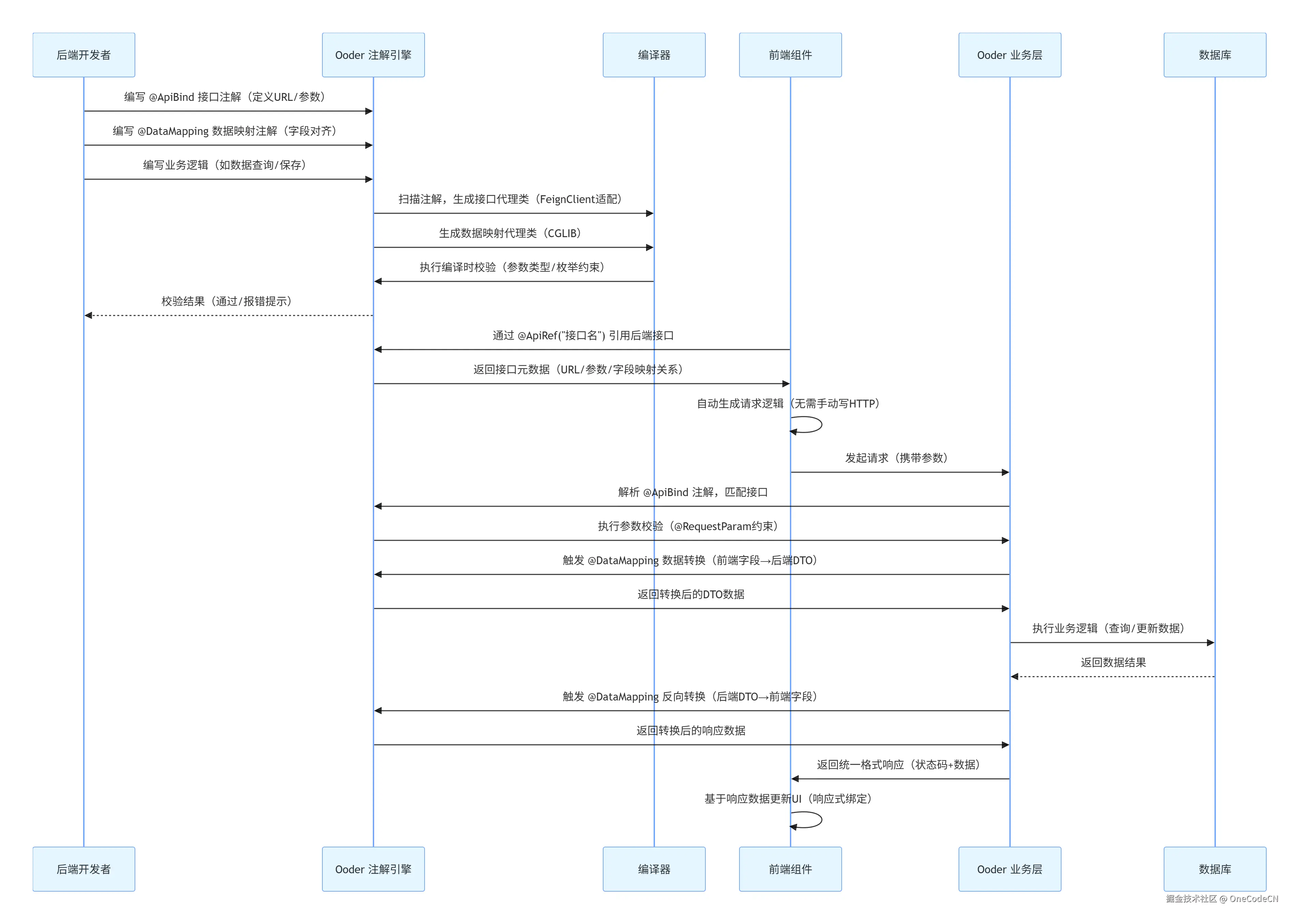 传统全栈开发的痛点在于"前后端对接碎片化":前端写请求代码、后端写接口文档、字段映射需手动适配。OOD的解法是"注解驱动全栈衔接":