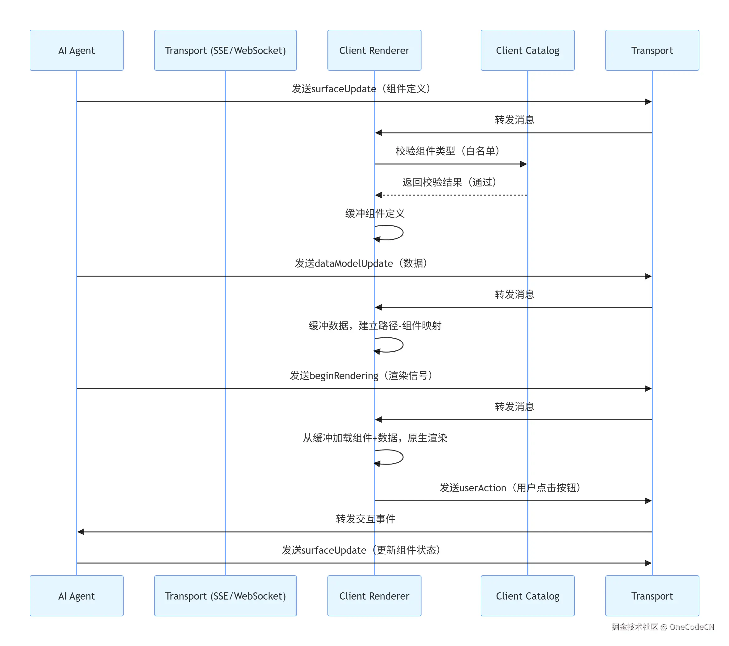 安全逻辑 :AI发送surfaceUpdate后,客户端先校验组件类型是否在Catalog中,不存在则直接丢弃------从根源杜绝恶意组件注入。