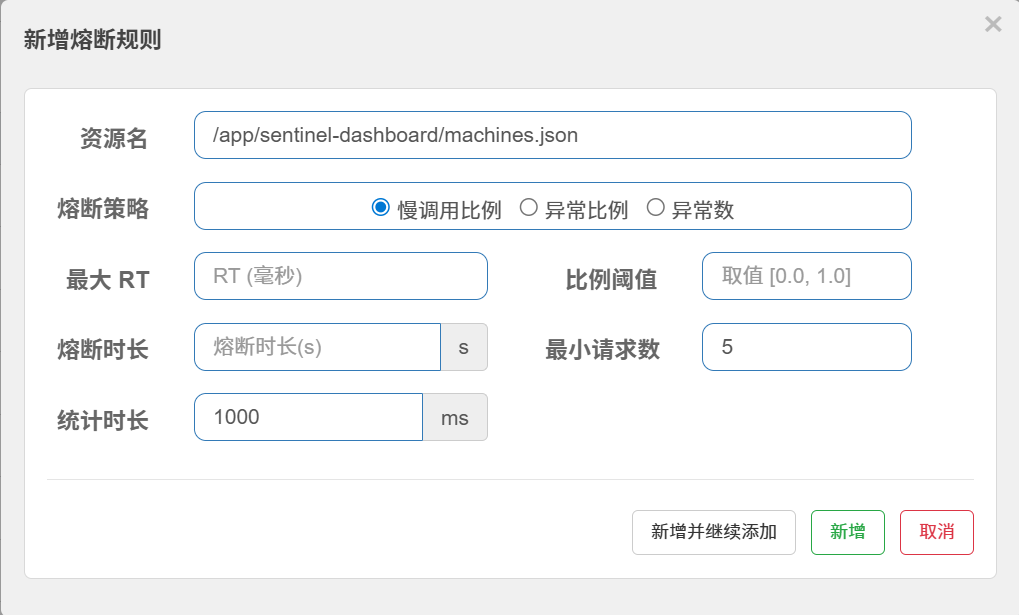 熔断操作也可以在 Sentinel 进行配置,点击熔断之后就会弹出下面窗口: