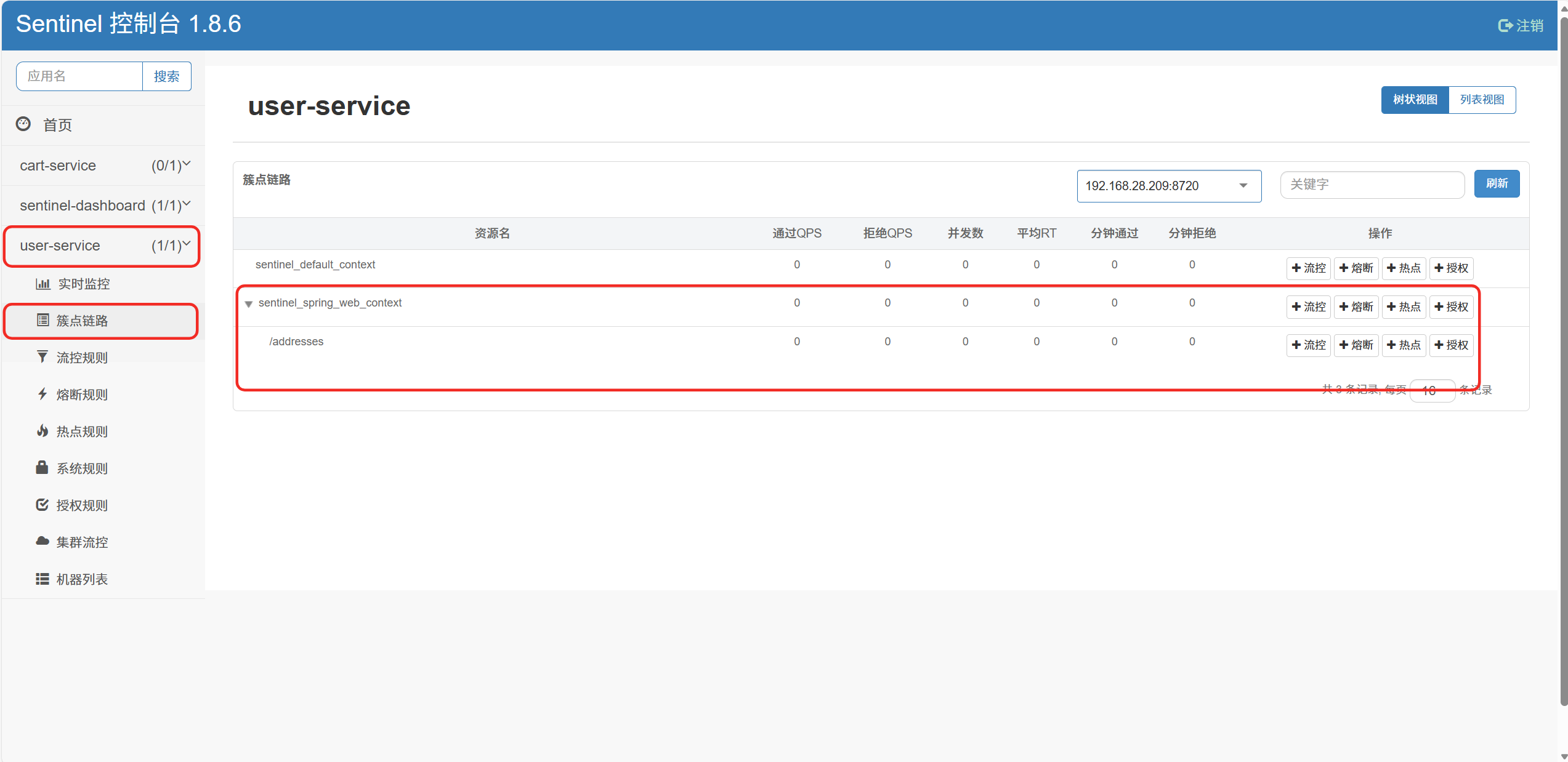 说明:「簇点链路」展示的是单机维度的调用链路,即一次请求进入服务后所经过的、被 Sentinel 监控的资源节点。默认情况下,Sentinel 会自动监控 Spring MVC 中的所有 Controller 接口,并将其注册为资源。