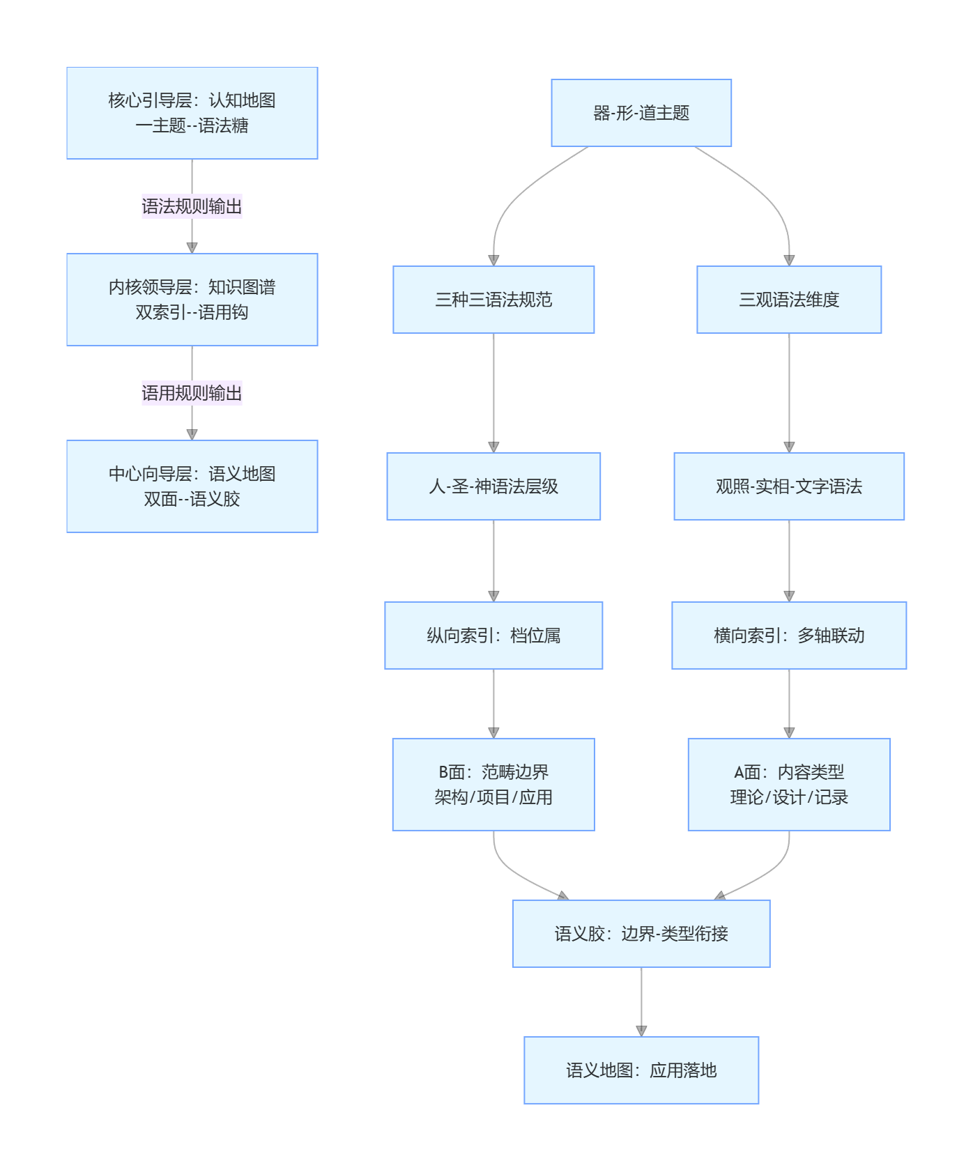 B2[多轴联动索引<br/>观照→实相→文字] --> B21[语用追溯:观照(认知)/实相(设计)/文字(记录)]