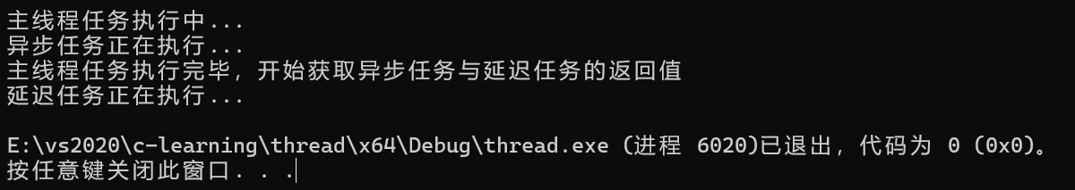 cout << "主线程任务执行完毕,开始获取异步任务与延迟任务的返回值" << endl;