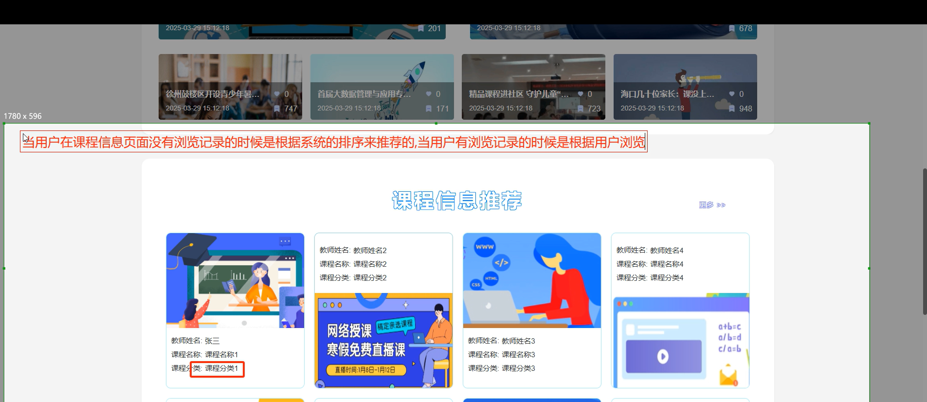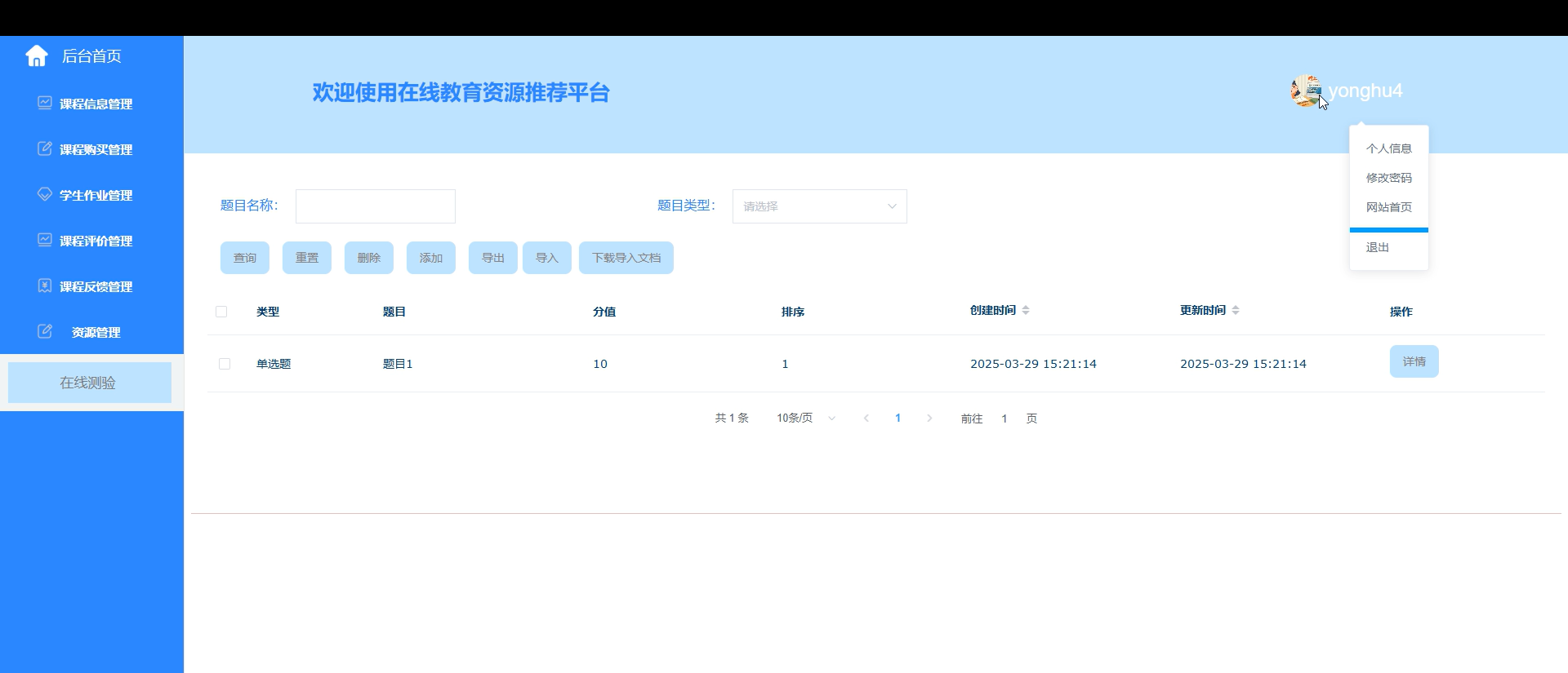支持教师创建、编辑、发布或删除课程;管理员管理课程分类;通过协同过滤算法,根据学生行为数据推荐个性化课程。