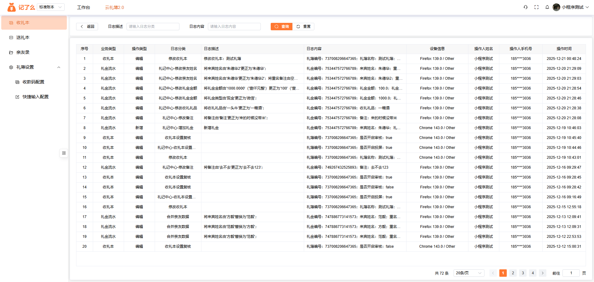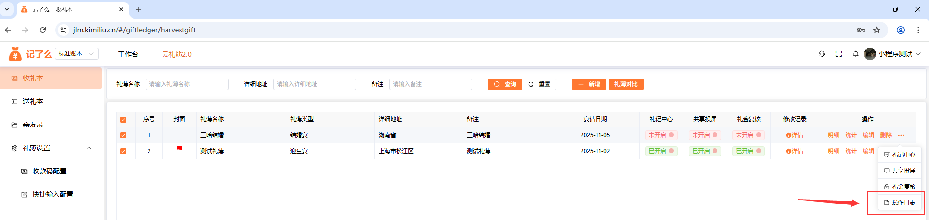 操作日志:可以查看你或者授权礼金先生操作的所有操作记录,可核查和追溯礼金的每一笔添加、修改。