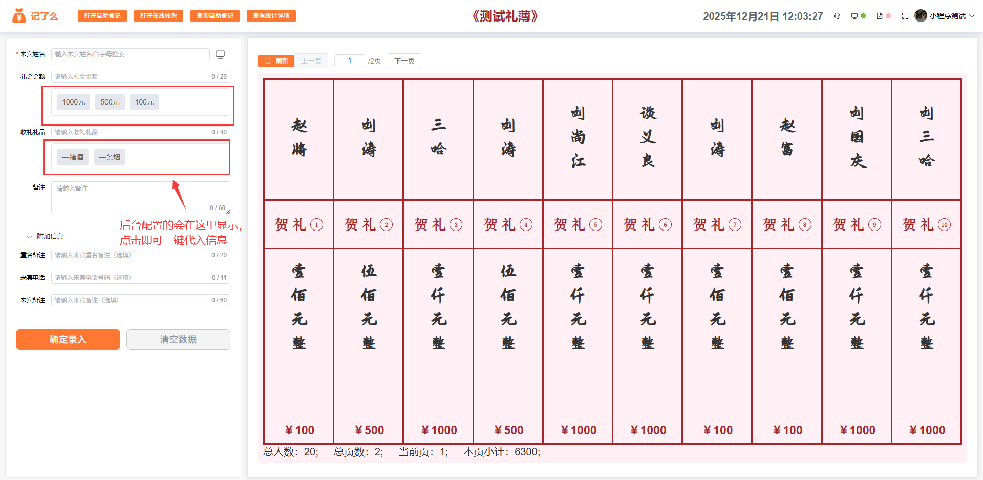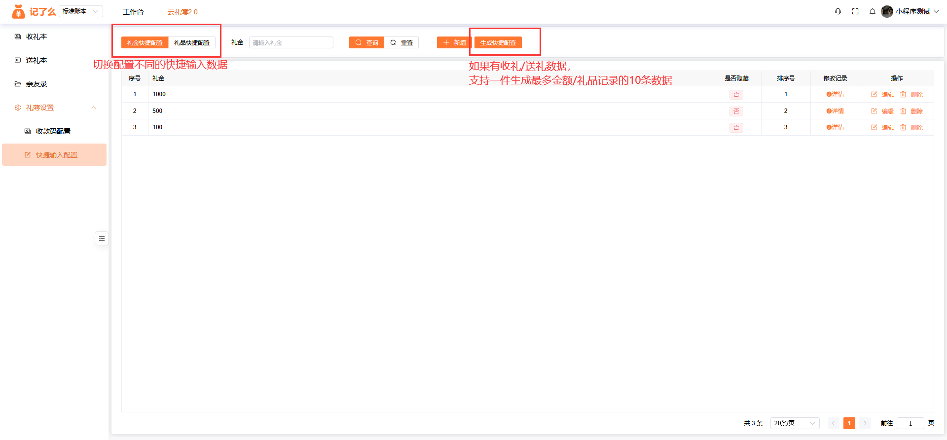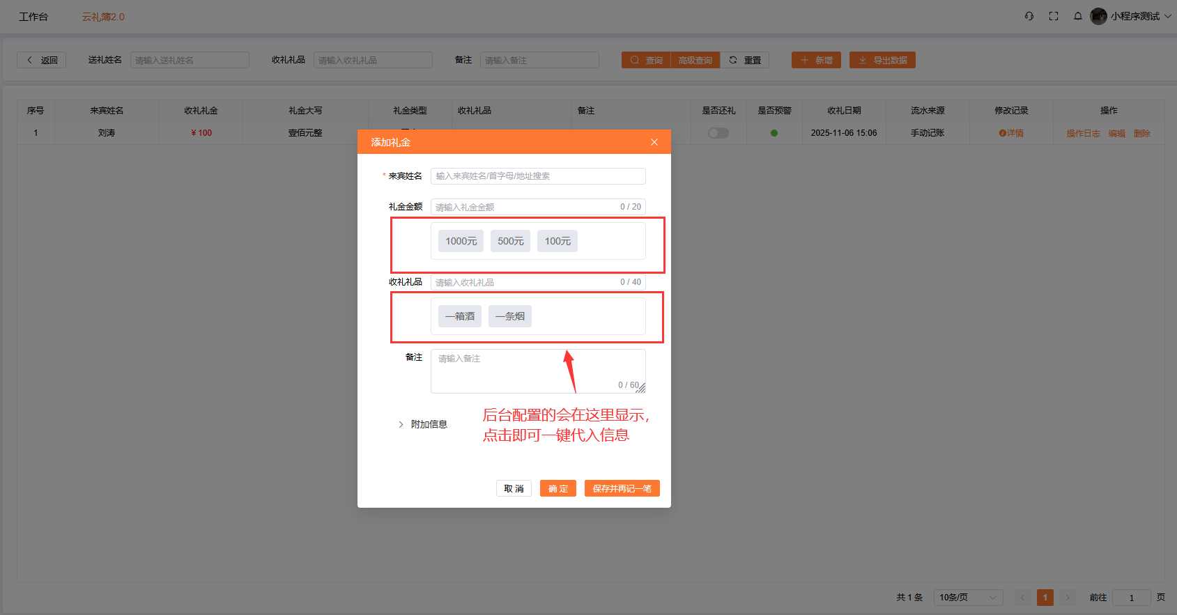 这里可以配置礼金/礼品快捷输入配置,方便礼记先生无需输入,一键即可代入要随礼的礼金/礼品。