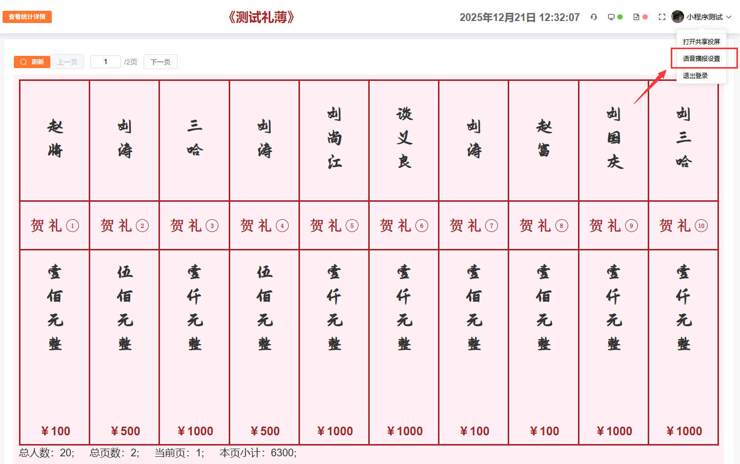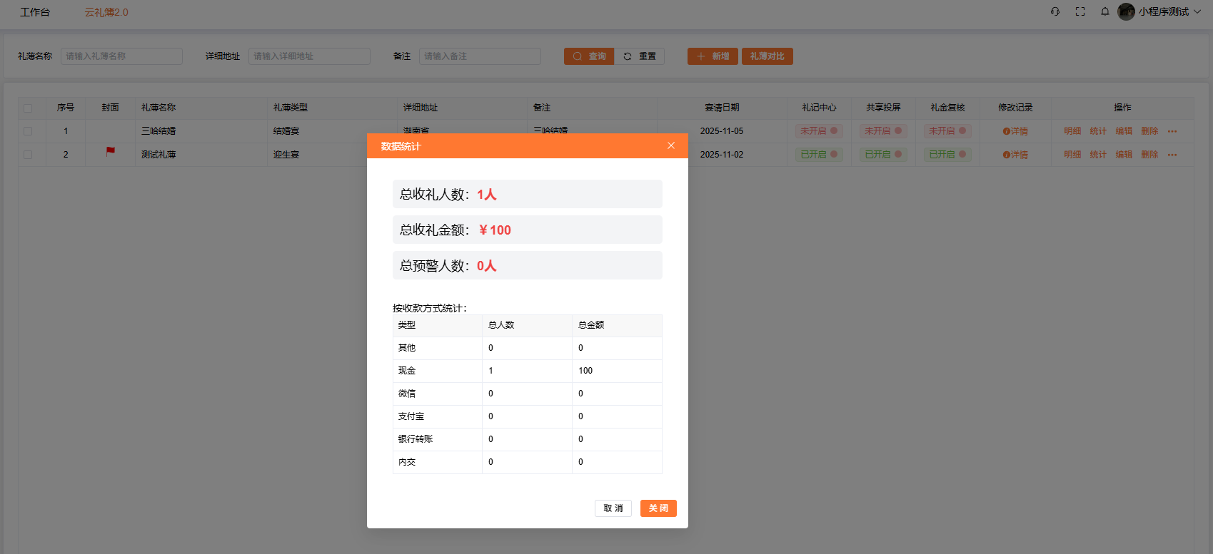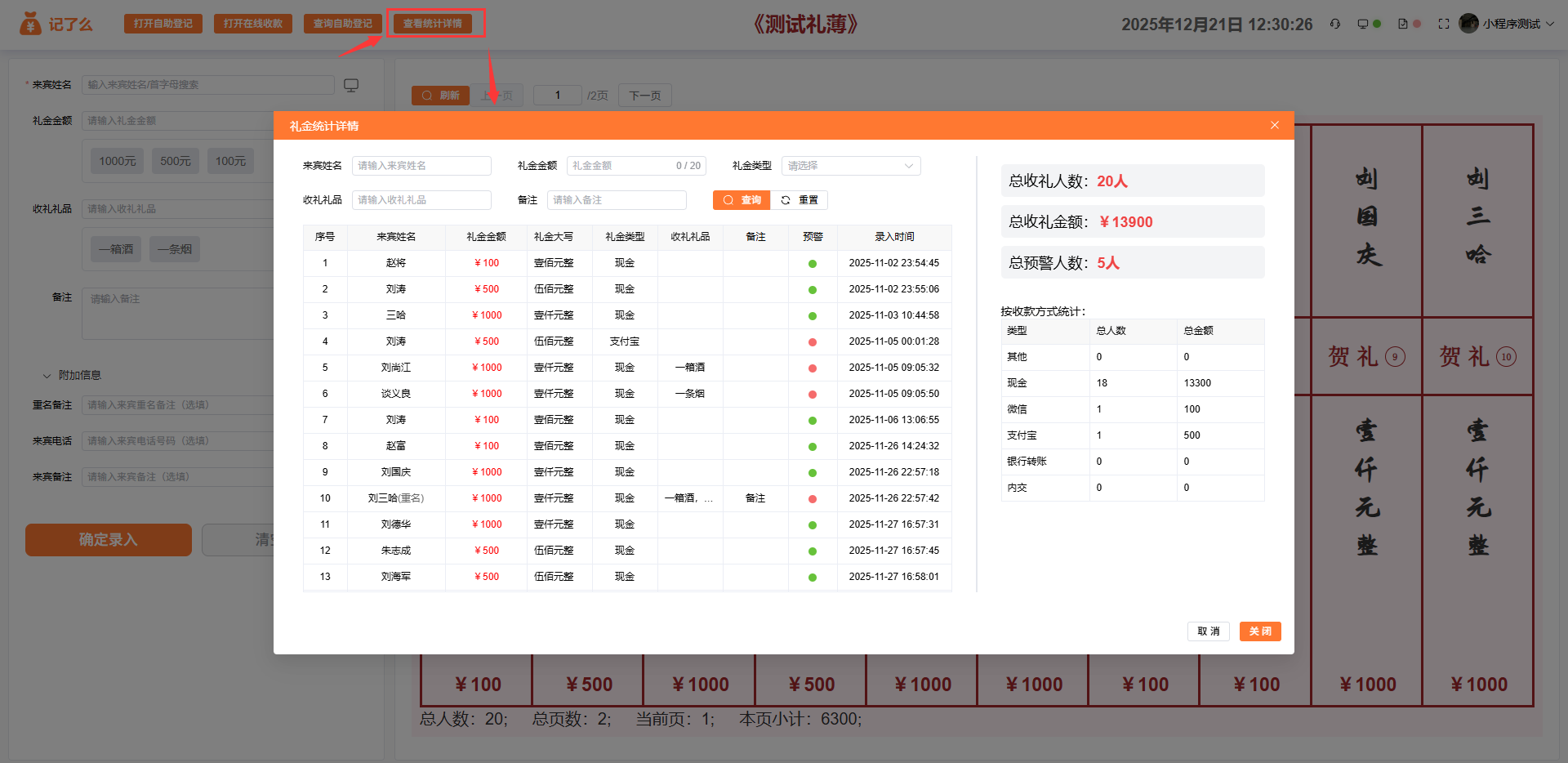 数据统计:可以查看此收礼本总收礼人数、收礼礼金金额,按收款方式分类汇总。