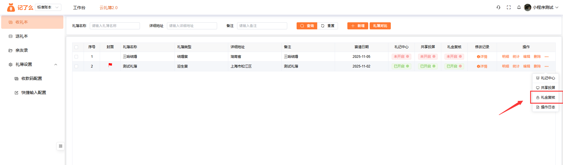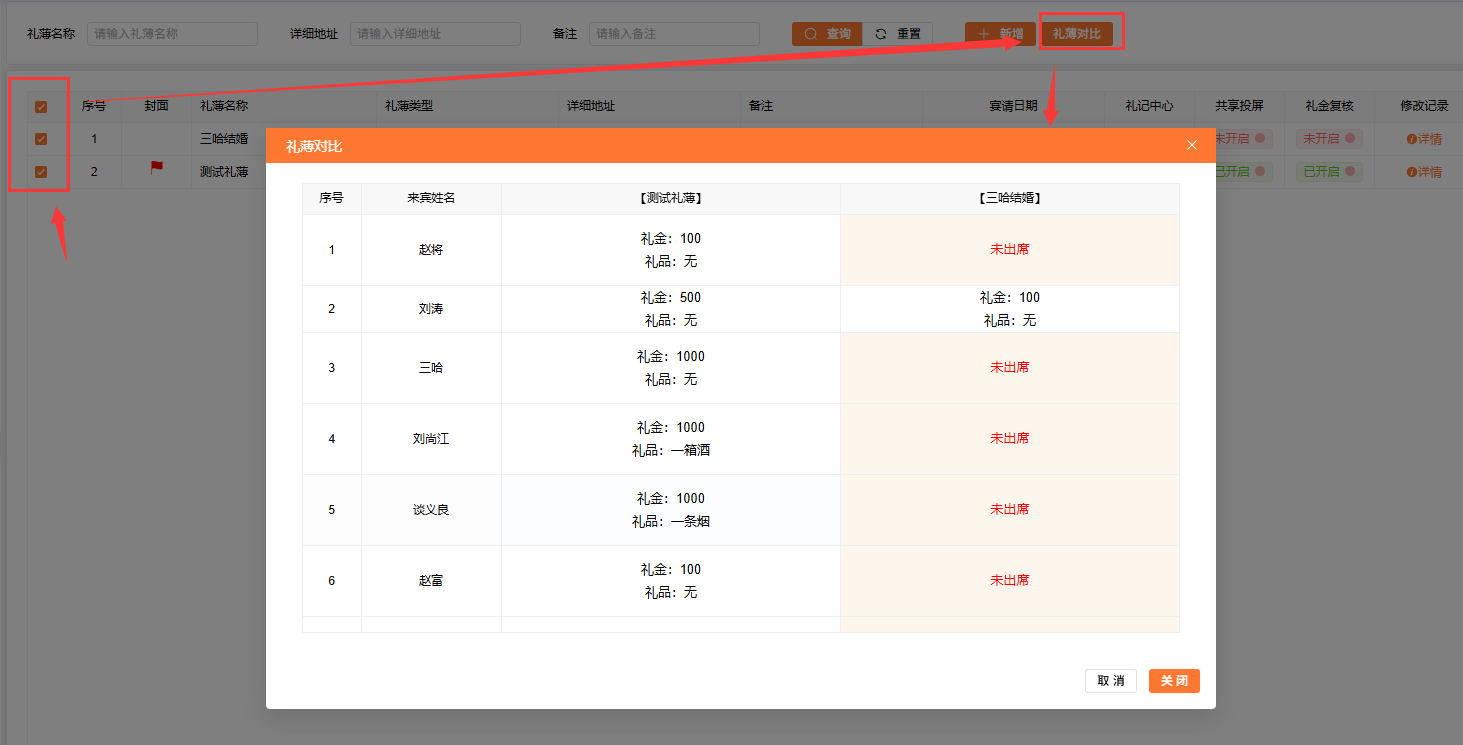 礼薄对比:可以勾选你需要对比的礼薄,点击礼薄对比,可以看到随礼人哪些宴请来了、哪些宴请没有来随礼。