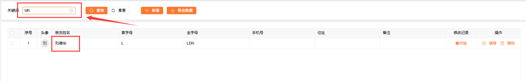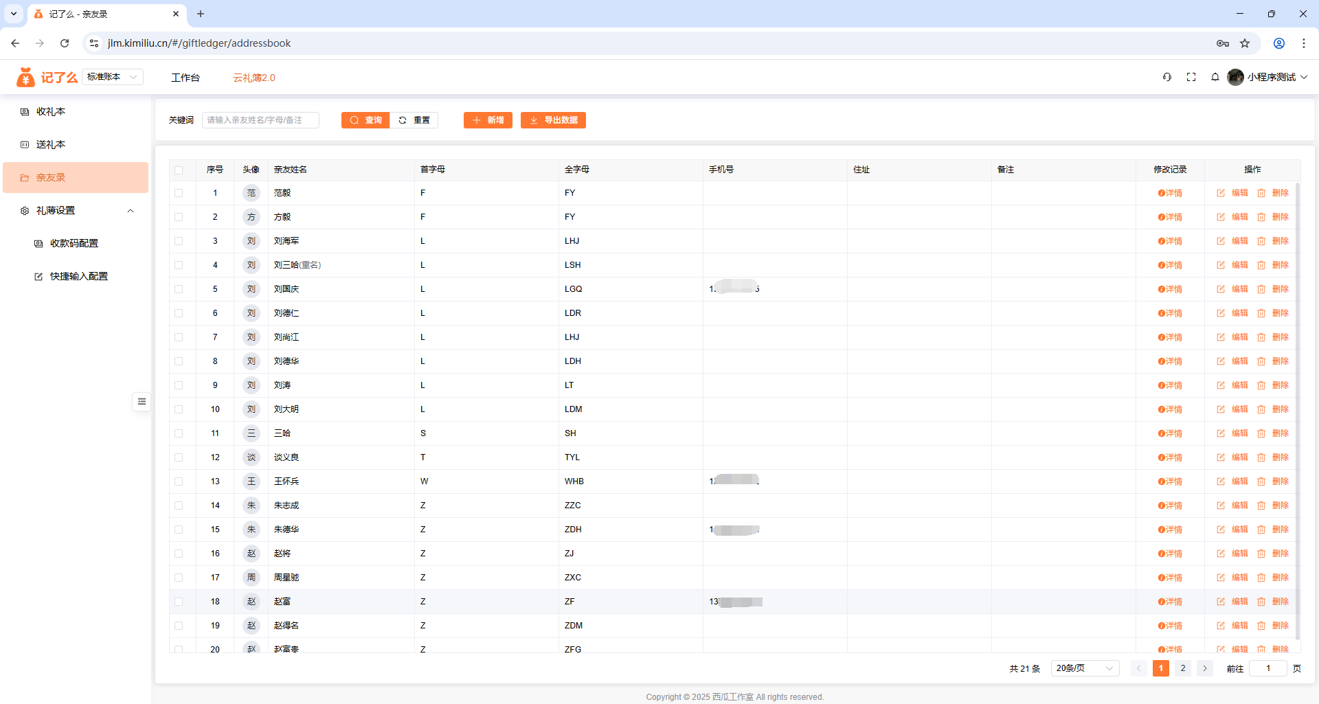 列表:在收礼本/送礼本添加的亲友,都会展示到这里,也可以手动在当前页面对亲友进行添加、编辑、删除操作,支持导出亲友数据。添加亲友系统会根据亲友姓名生成首字母,收礼/随礼可根据首字母、手机号、地址、姓名等信息查询到需要的亲友。