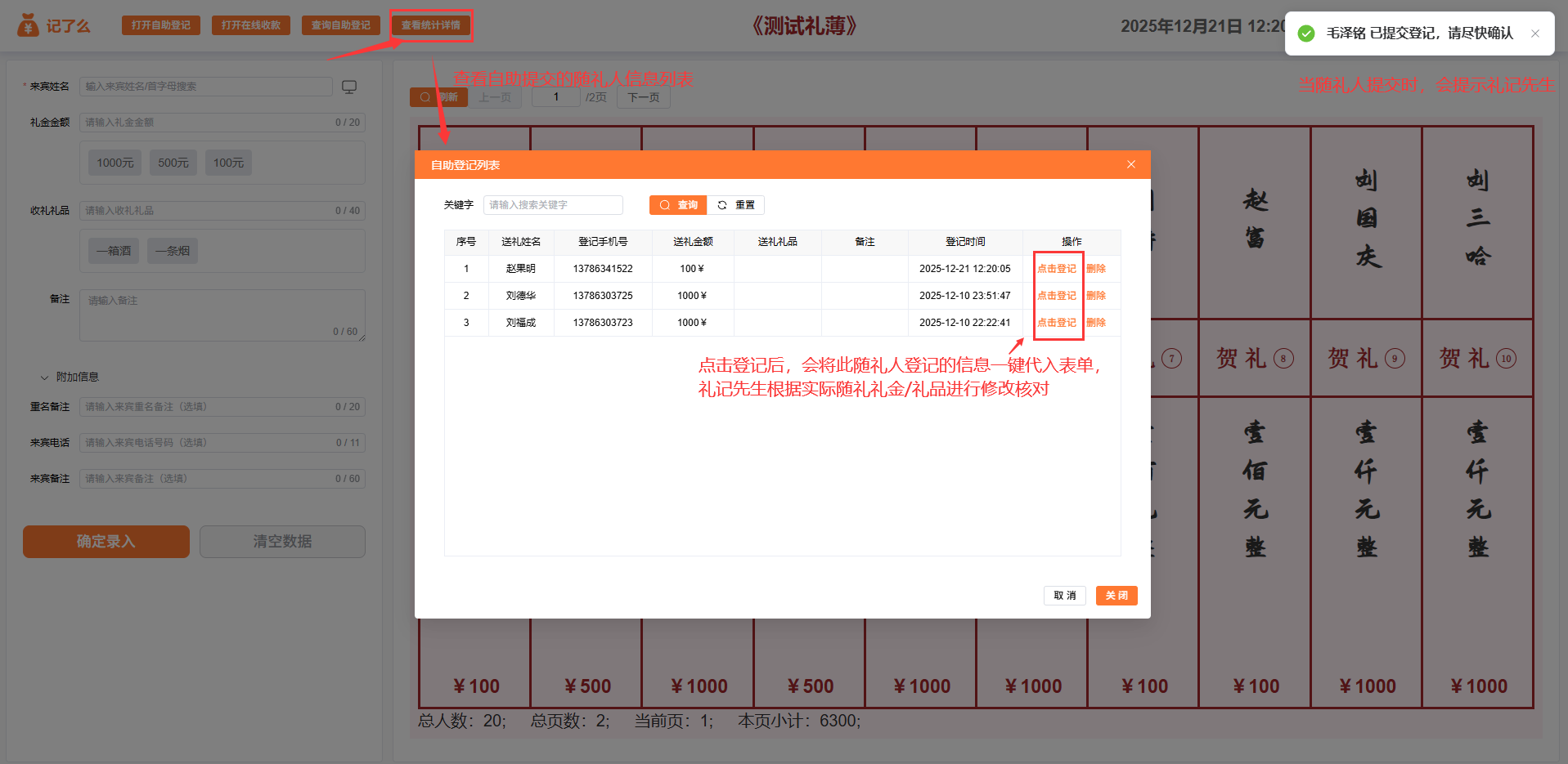 当随礼人提交登记后,礼记先生可以在【自助登录列表】查看登记信息。当随礼人提交后,会在右上角提示礼金显示有新的提交;点击【一键登记】会将随礼人信息代入表单,礼记先生可以根据实际情况修改核对礼金/礼品信息。