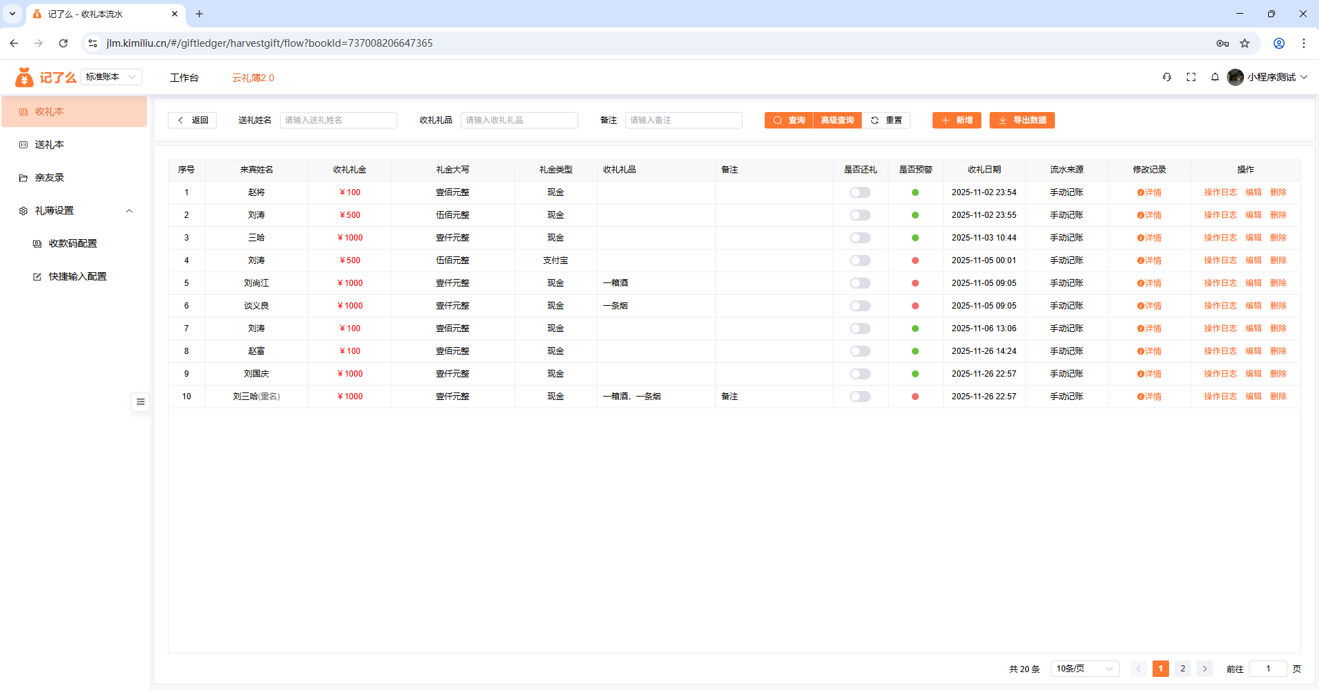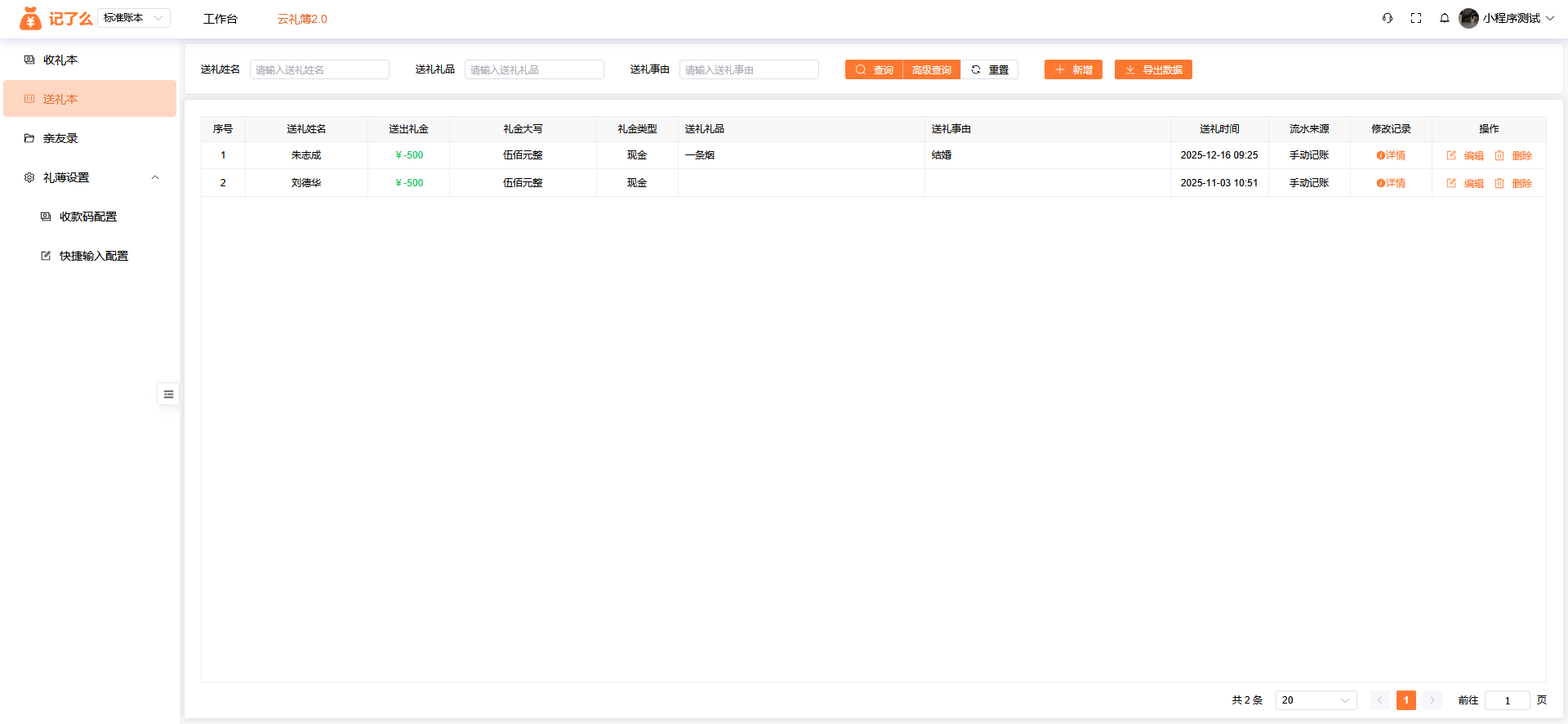 可以查看所有每一条随礼信息,对礼金进行添加、编辑、删除、导出;