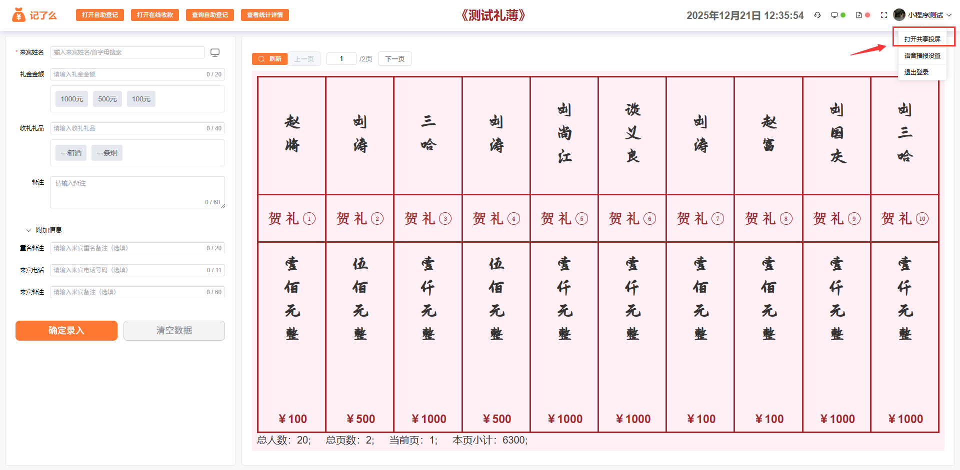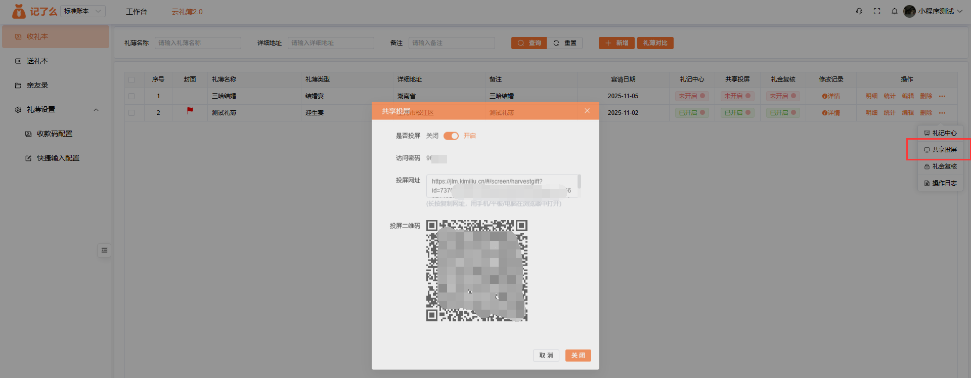 可以在后台管理-收礼本-共享投屏:开启后,在需要投屏的电脑/ipad/手机打开链接,或者手机直接使用微信扫描二维码进行投屏。当礼金先生操作:添加礼金、打开草稿纸画板、自助登记、在线收款等操作会实时在投屏端显示。