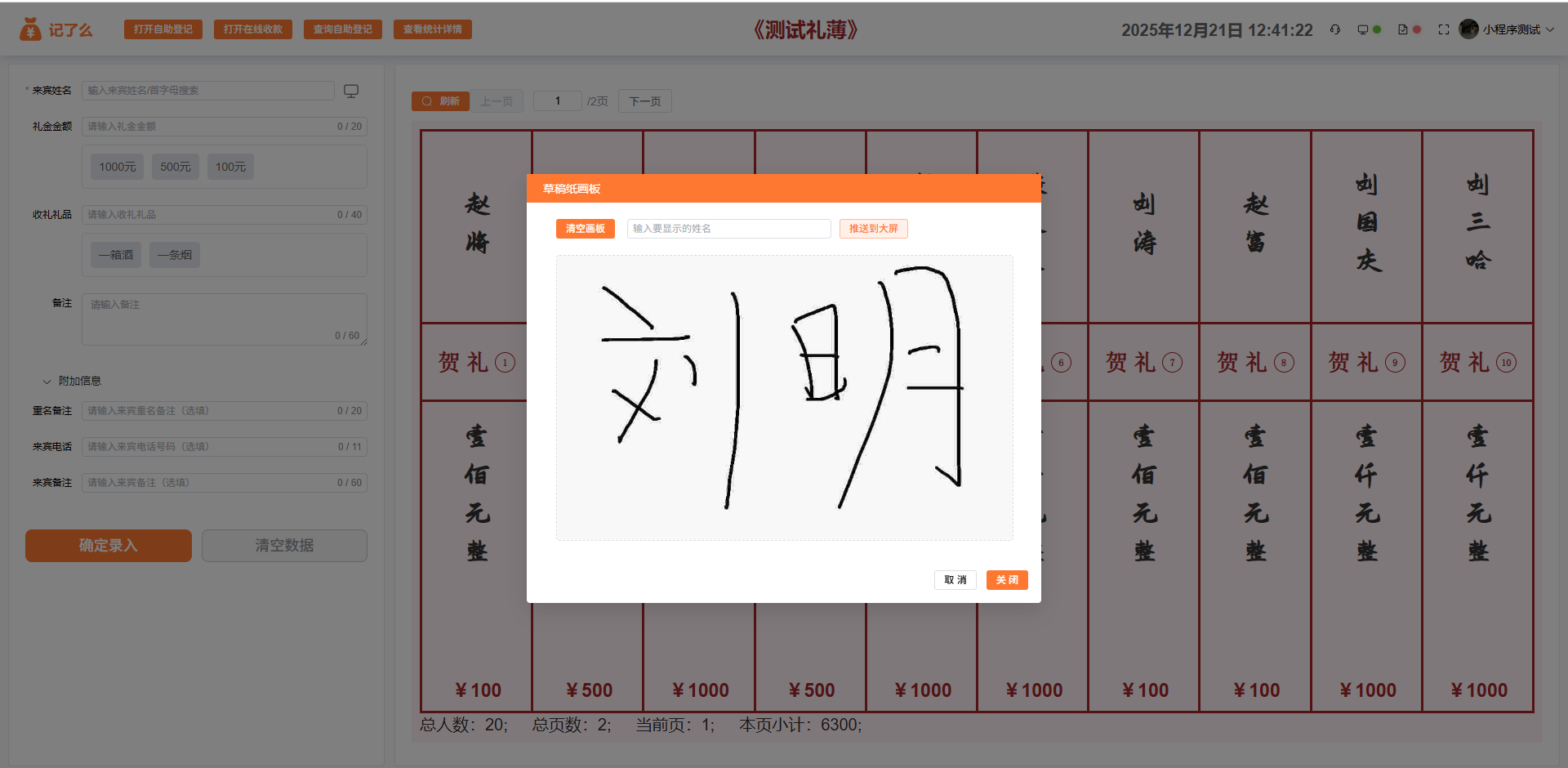 遇到不会输入的字时,可以让在电脑投屏让随礼人使用鼠标自行写名字,或者在ipad/手机打开投屏界面直接手写名字。