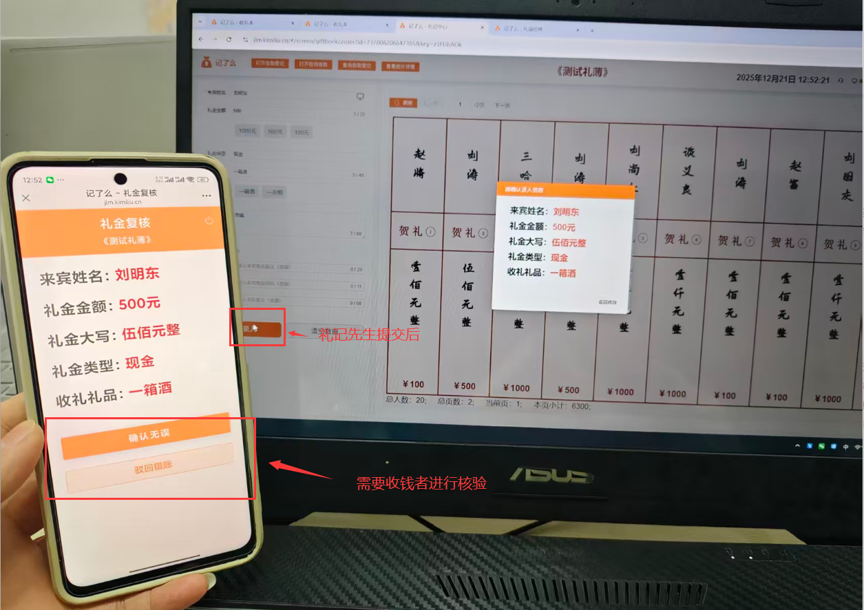 当礼记先生确认提交录入时,可以让随礼人在投屏端进行信息核对:名称、礼金礼品、付款方式等数据。