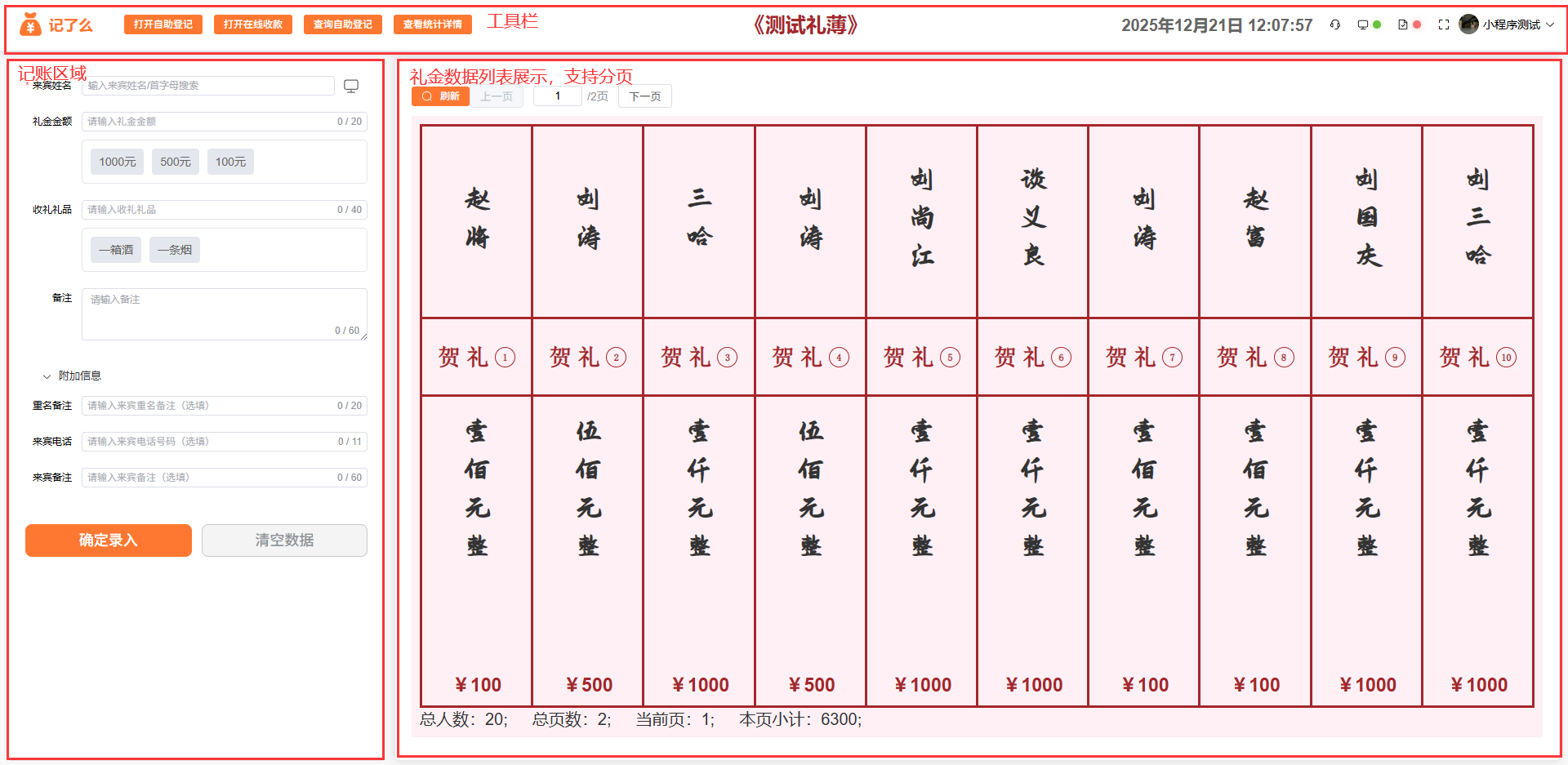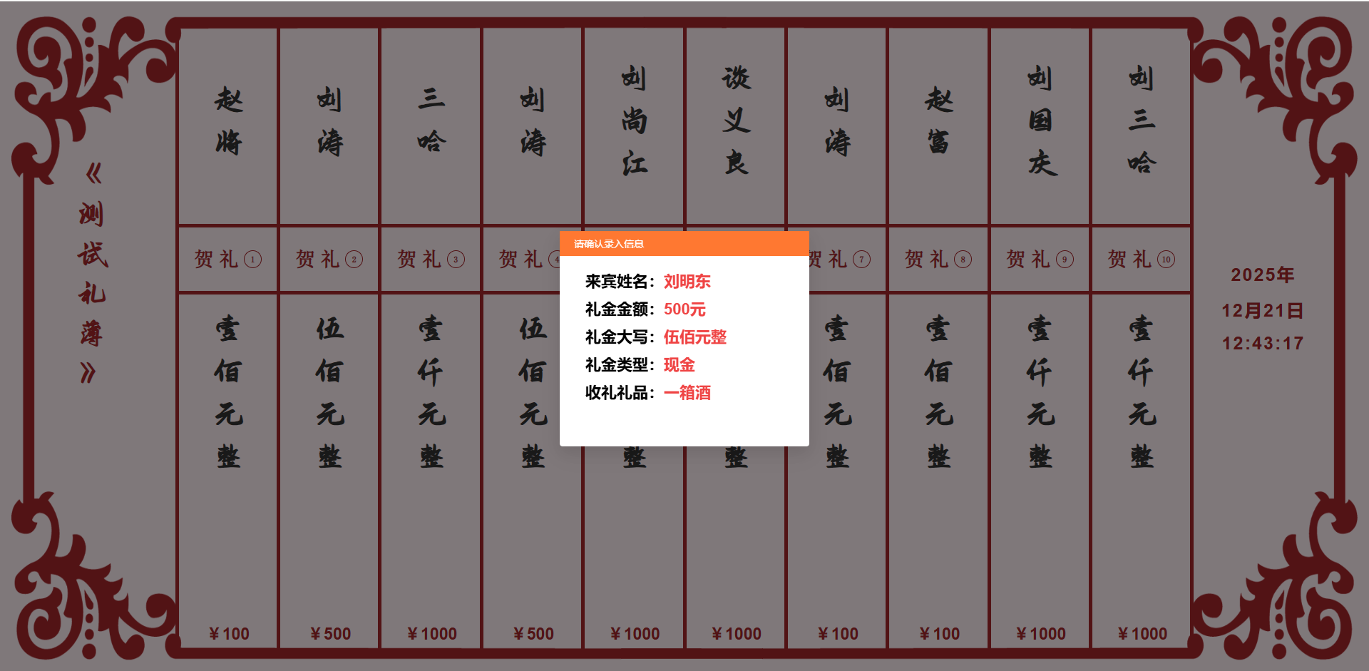 - 效率低下:手写记录速度慢,无法应对多人同时送礼的场景,易出现漏记、错记;