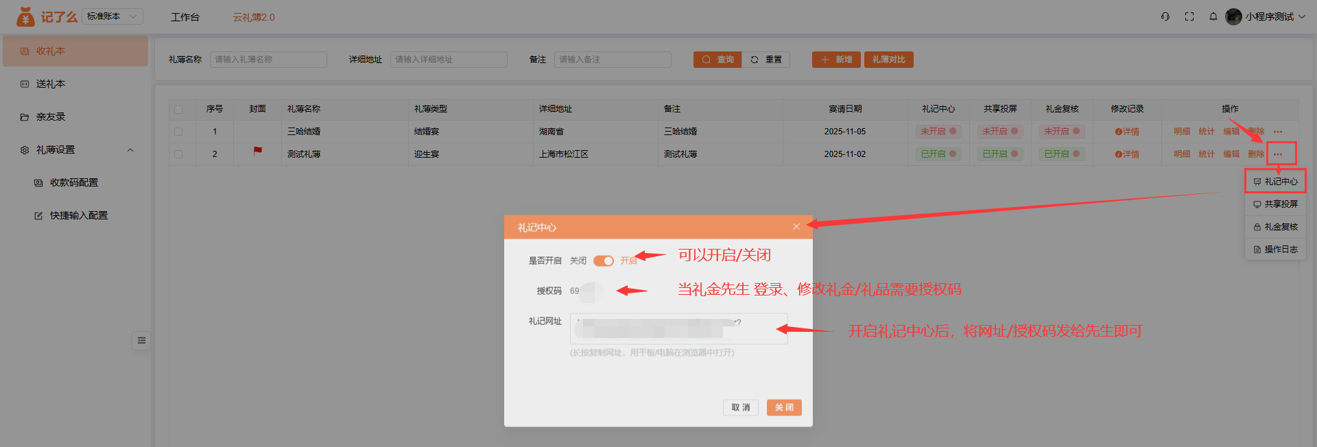 操作前提(推荐开启):1人记账,1人收钱(授权者进行礼金核对),防止1人记账+收钱进行做假账。