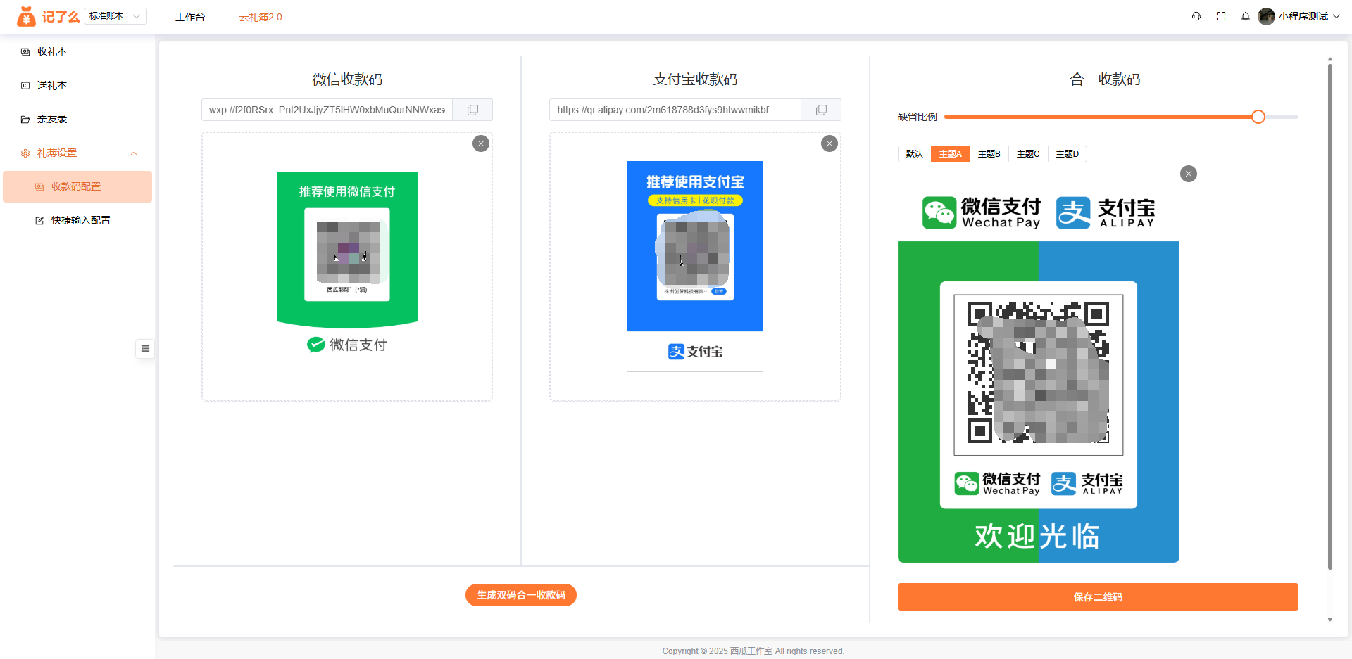 这里可以上传礼金先生的个人微信/支付宝收款二维码。不建议使用东家收款二维码,建议上传礼金先生的,方便先生实时核查收款金额,最好在打开手机收款语音播报功能。等宴请结束,在统一转账给东家。支持生成二码合一收款二维码。