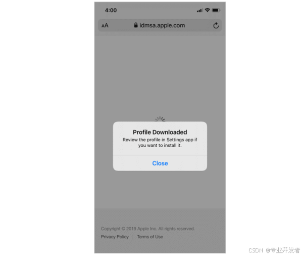 浏览器会下载配置文件。当出现以下界面时,说明配置文件已下载完成。根据提示 "若要安装,请在设置应用中查看该配置文件",请打开 iOS 设备上的 "设置" 应用。