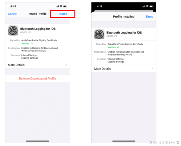 现在,点击 "安装" 按钮(红色矩形区域)来安装配置文件(见右侧图片)。此时配置文件已成功安装。