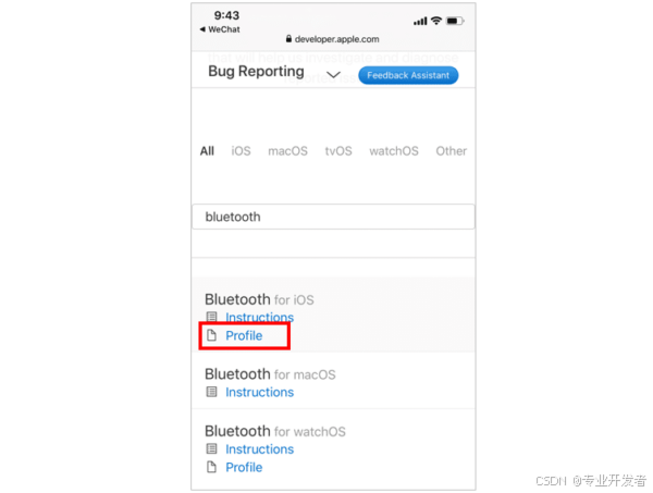 页面加载完成后,点击 "Bluetooth for iOS" 下方的 "Profile"(红色矩形区域)。