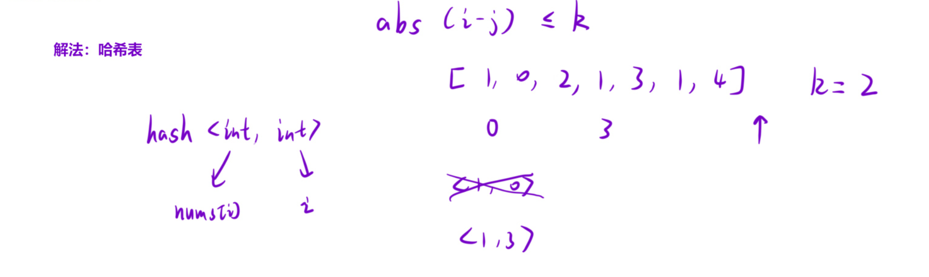 细节:如果遇到两个重复元素,1(0)和1(3)它们下标的差大于2,此时再把{1,3}加入哈希表的时候,会覆盖之前{1,0}的数据,没有关系,因为求的下标差小于等于k,所以两个重复数字肯定是越近越好,把之前远的数据覆盖不会影响结果