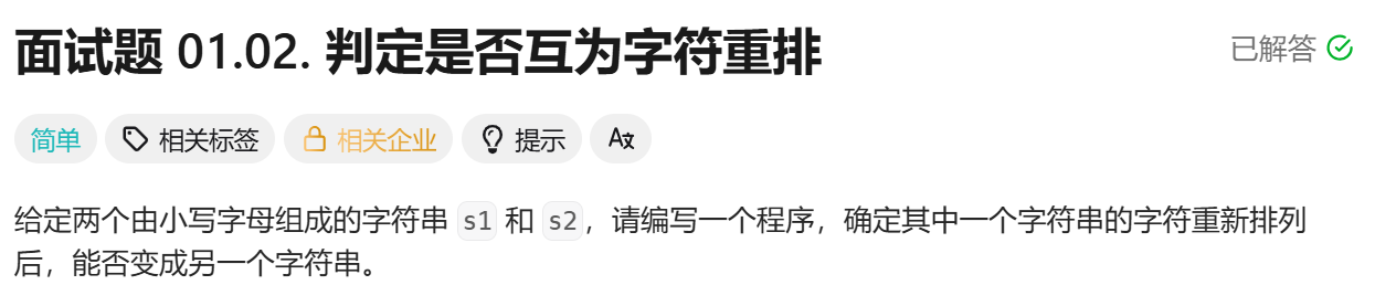 题目链接:https://leetcode.cn/problems/check-permutation-lcci/description/