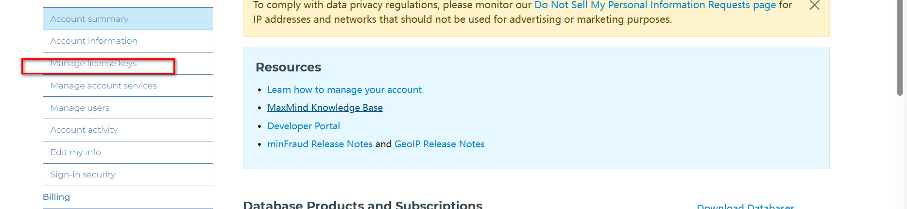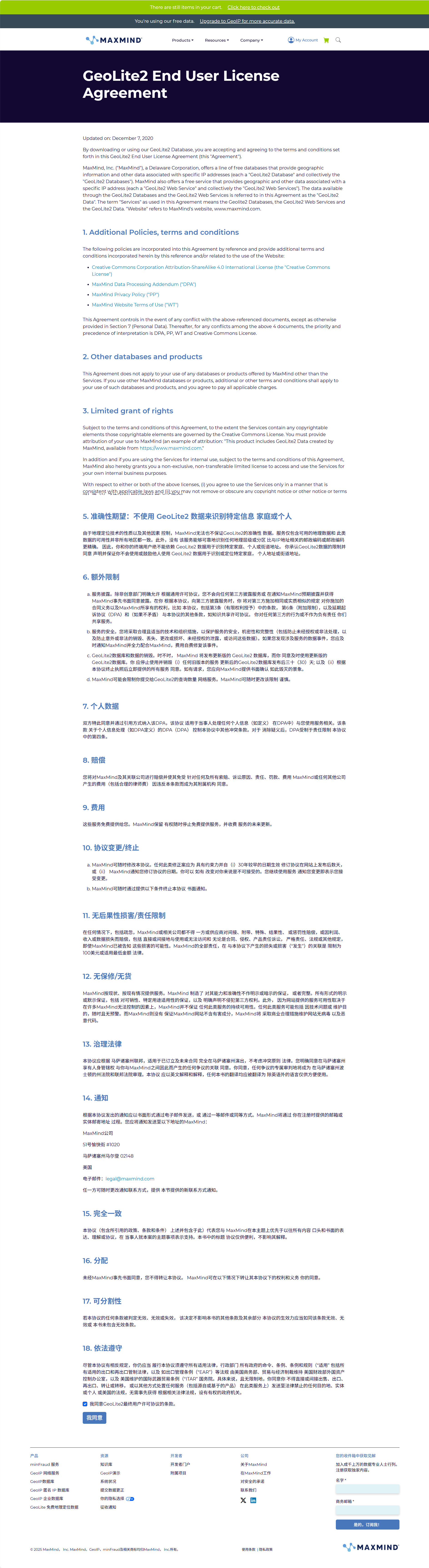 注册登录成功之后,要想获取到免费产品的订阅信息,还需要同意GeoLite2 End User License Agreement协议,否则登录之后,在个人账号门户是看不到GeoLite2下载信息的。