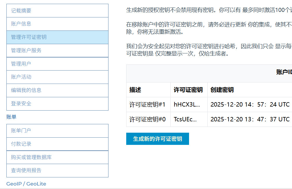 GeoIP.conf,填写对应的AccountID 账号IDLicenseKey 复制的License,都可在登录后的个人中心获取