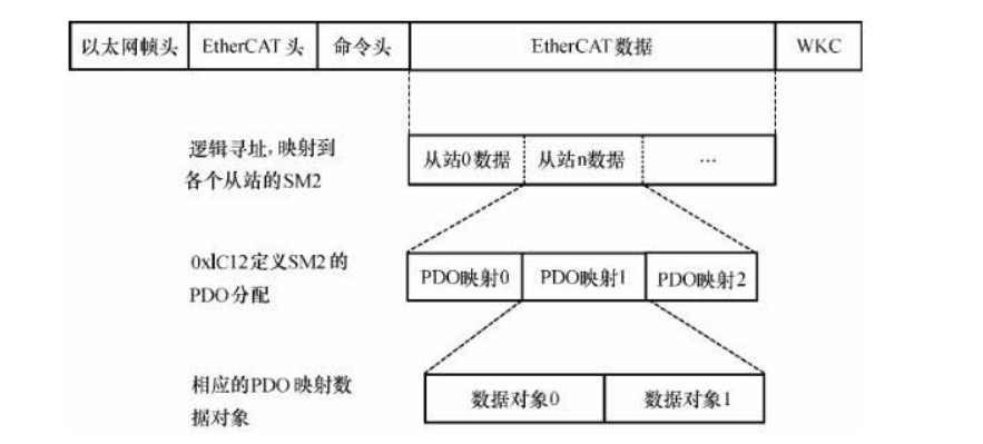 (图 PDO 分配示意图:以太网帧头→EtherCAT 头→命令头→EtherCAT 数据→WKC;EtherCAT 数据逻辑寻址映射到各个从站的 SM2;0x1C12 定义 SM2 的 PDO 分配;从站数据对应 PDO 映射 0/1/2,再映射到数据对象 0/1)