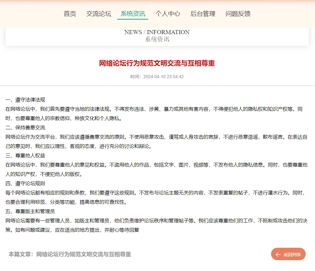(3)交流论坛管理:用户进行交流管理,查看相关论坛信息,并可以对其进行发布,也可以对其他人进行评论。