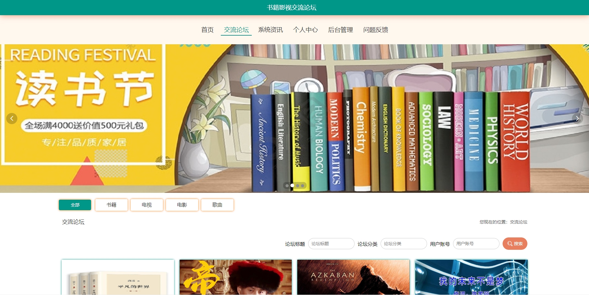 本书籍影视交流论坛网站有管理员,用户,普通管理员。管理员功能有个人中心,用户管理,普通管理员管理,书籍影视交流论坛类别管理,交流书籍影视交流论坛管理,系统管理等。用户功能有个人中心,交流书籍影视交流论坛管理,我的收藏管理,系统管理等。普通管理员有个人中心,交流书籍影视交流论坛管理等。因而具有一定的实用性。