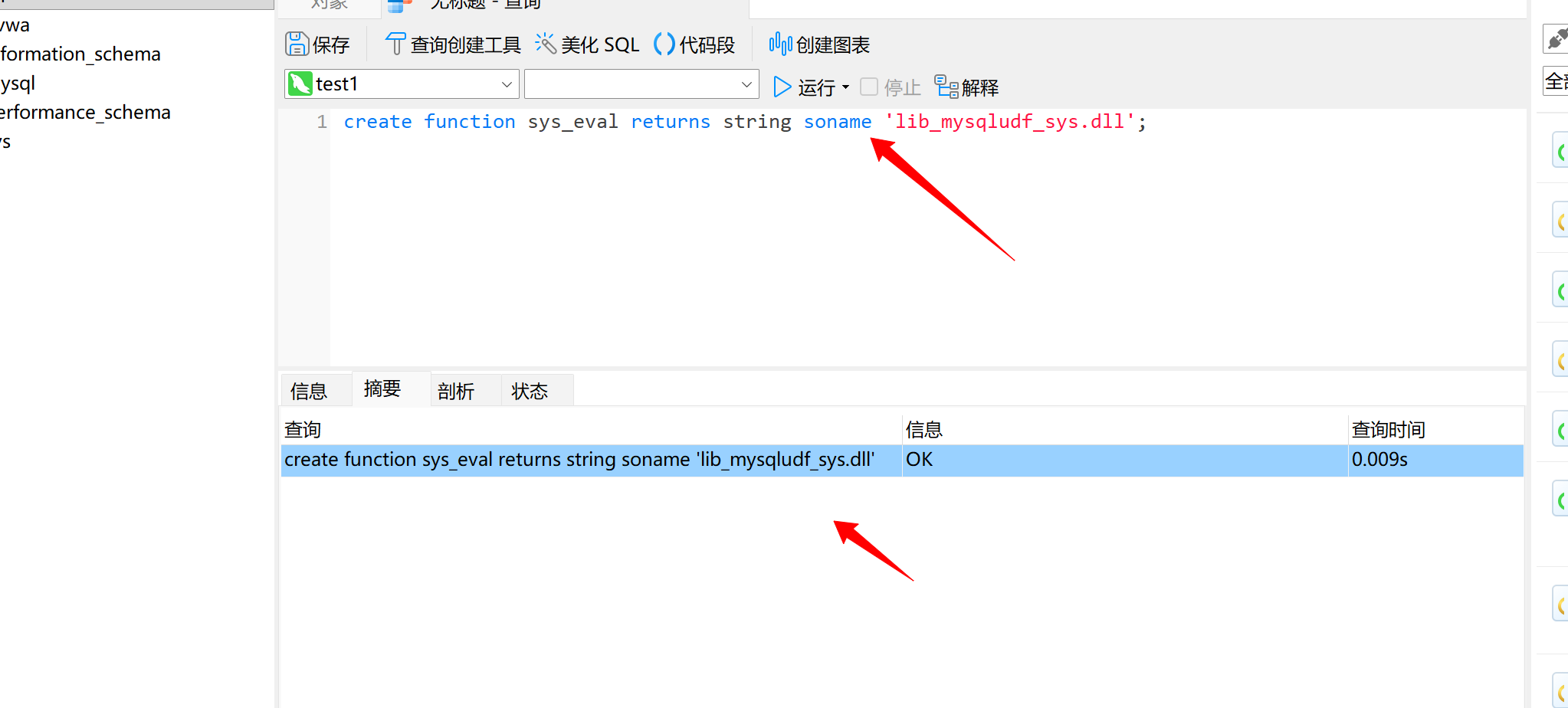 原理:用户自定义的函数被当作本机函数执行,在使用CREATE FUNCITON调用dll中的函数后,mysql账号转化为system权限,从而实现提权。