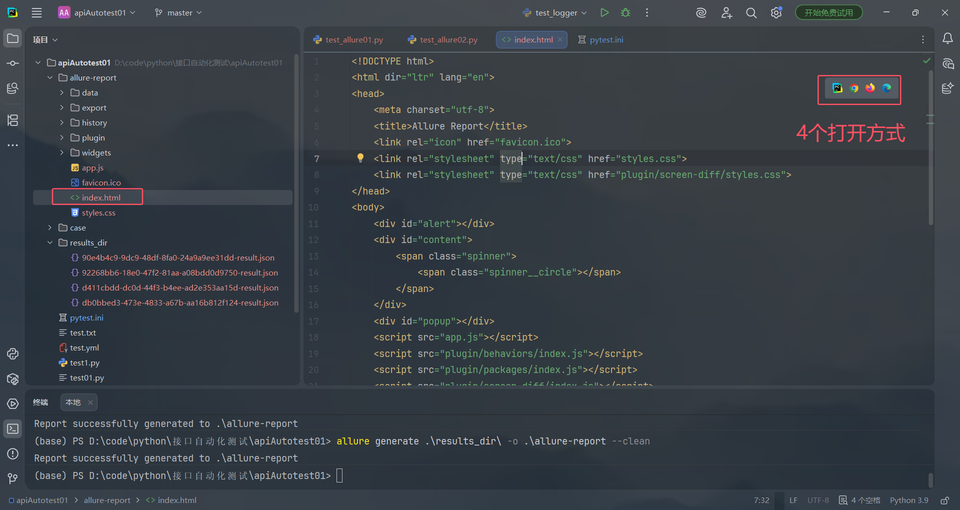 1)方法一:启动一个本地服务器来在浏览器中展示测试报告终端执行命令,自动在浏览器打开测试报告