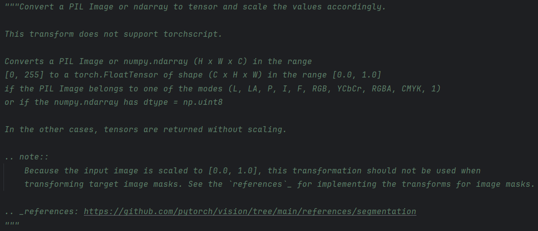 其主要可以转化PIL图像和ndarray数组,同时在转化后还可以将数据进行归一化处