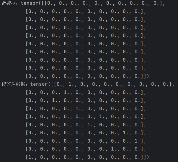 import torch target_onehot = torch.zeros(10, 10) # 创建源数据 print(f'源数据:{target_onehot}') target = torch.tensor([1, 3, 2, 4, 6, 5, 8, 9, 7, 0]) # 创建索引张量 target_onehot.scatter_(0, target.unsqueeze(1), 1.0) print(f'修改后数据:{target_onehot}')由上图可以看到最后的输出都是target_onehot,因此该函数会直接覆盖原本的数据,该函数中其这个作用的便是_,函数名中的下划线