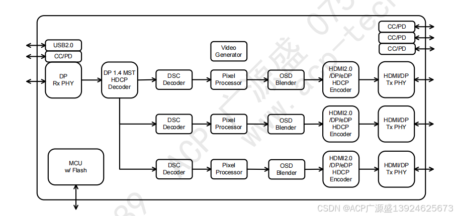 - 集成度高:单芯片集成 DP/RX、3 路 TX、3 路 DSC、OSD、MCU、PD,减少 PCB 面积 30%+,降低 BOM 成本;