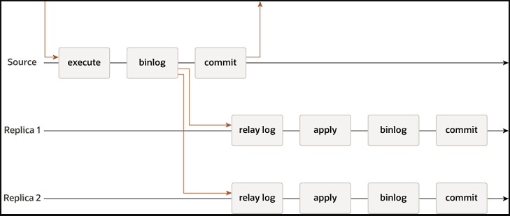 如上图所示,主库及从库中涉及的组件主要做如下动作: