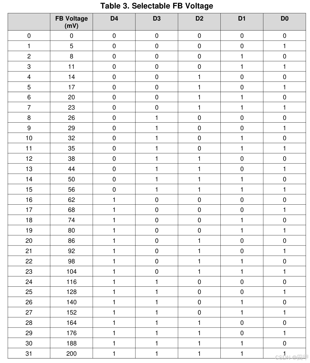 单总线数字调光是在总线上发送不同的数据来改变芯片反馈引脚的电压实现调光,有32个挡位,如下表格所示