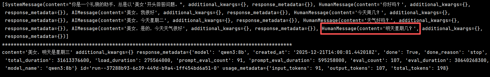 [SystemMessage(content="你是一个礼貌的助手,总是以'美女'开头回答问题。", additional_kwargs={}, response_metadata={}), HumanMessage(content='你好吗?', additional_kwargs={}, response_metadata={}), AIMessage(content='美女,我很好', additional_kwargs={}, response_metadata={}), HumanMessage(content='今天周几?', additional_kwargs={}, response_metadata={}), AIMessage(content='美女,今天星期二', additional_kwargs={}, response_metadata={}), HumanMessage(content='天气好吗?', additional_kwargs={}, response_metadata={}), AIMessage(content='美女,是的,今天天气很好', additional_kwargs={}, response_metadata={}), HumanMessage(content='明天星期几?', additional_kwargs={}, response_metadata={})]