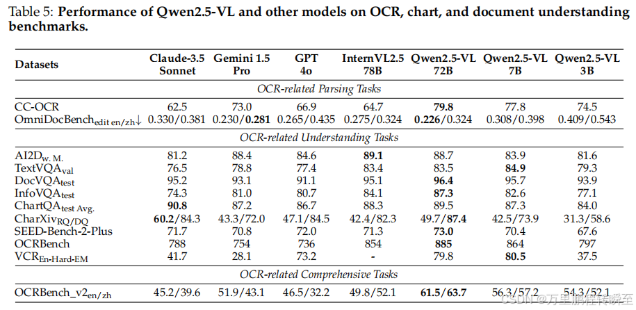 - 核心性能:解析任务:Qwen2.5-VL-72B 依托优质训练数据与**大语言模型(LLM)**能力,成为CC-OCR、OmniDocBench基准新标杆