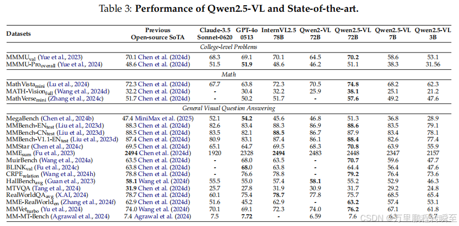 MMStar:Qwen2.5-VL 得分 70.8,领先其他模型;小规模版本中,7B 达 63.9%,3B 达 55.9%