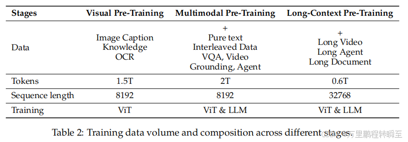 - 图像标题、交错图文、OCR、视觉知识(名人/地标/动植物)、多模态学术问题、定位数据 、文档解析数据、视频描述、视频定位、代理交互数据;