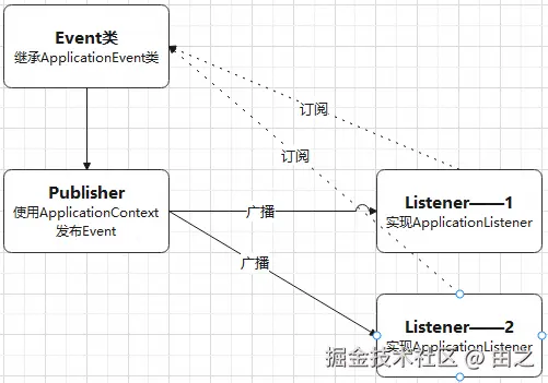- Listener:一个或多个监听器,当Publisher发布Event后,其能给监听并执行Listener重定义的onApplicationEvent方法。